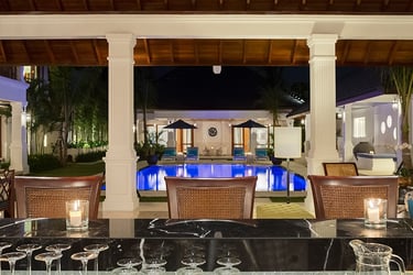 Six over-sized bedrooms and a stunning amount of living space are spread across four pavilions arranged around the swimming pool. The colonial architecture – white-washed pillars, shaded verandahs with teakwood balustrades, chequer-board marble and granite floors, stained and etched glass windows – is complemented by the rich interiors. Plushly cushioned rattan sofas, plantation chairs, four-poster beds, leather ottomans and roll-top bathtub hark back to the days of grand travel – brought bang up to date with more contemporary luxuries such as Sonos sound system, satellite TVs, high-speed Wi-Fi, and a media room.