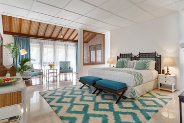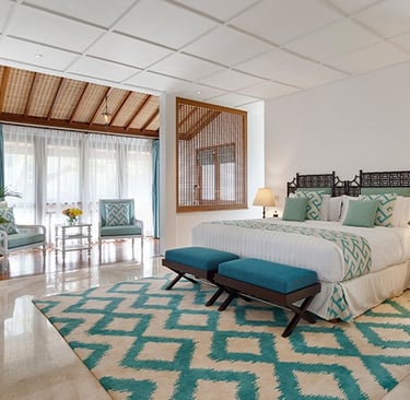 The crisp, white façade of the villa wraps around a dazzling T-shaped swimming pool combining modern and colonial architecture set amidst a lush tropical oasis. Villa Jajaliluna is both inspiring and practical offering three separate living areas, an open-plan kitchen and dining room, pool deck, outdoor dining terrace and four air-conditioned ensuite bedrooms. Taking inspiration from the island itself, the designers have used beautiful light and a balance of neutral tones and vibrant colours, exotic flora, vibrant culture and local artisans to create a luxurious ambience.