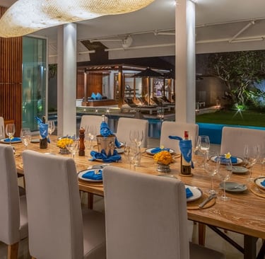 Find your private peace in one of the serene guest bedrooms, each with an ensuite bathroom and 43-inch TV. The downstairs master suite features a massive, spa-like bathroom while upstairs bedrooms overlook the tropical gardens below. Your little ones will love bunking together in the fanciful children’s bedroom, which comfortably sleeps five kids or four teenagers. Whether you’re visiting Bali with family or friends, Casa Evaliza invites you to create unforgettable memories in a setting designed for relaxation and enjoyment.