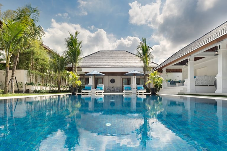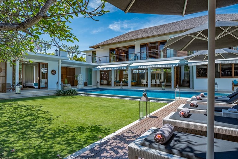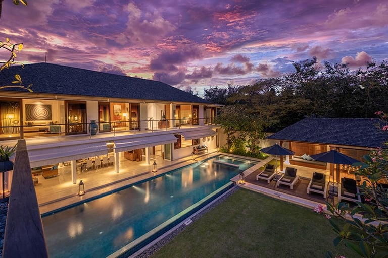 From the moment Villa Casa Evaliza’s front gates are flung open, its frangipani-scented gardens transport you to another world. Located just moments from Bali’s famously festive Seminyak neighbourhood, this stately, five-bedroom sanctuary cocoons you in an utterly serene ambiance, with only tropical birdsong and rustling leaves to be heard alongside your laughter with loved ones.