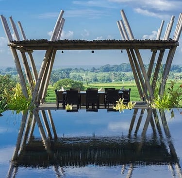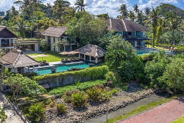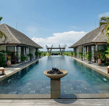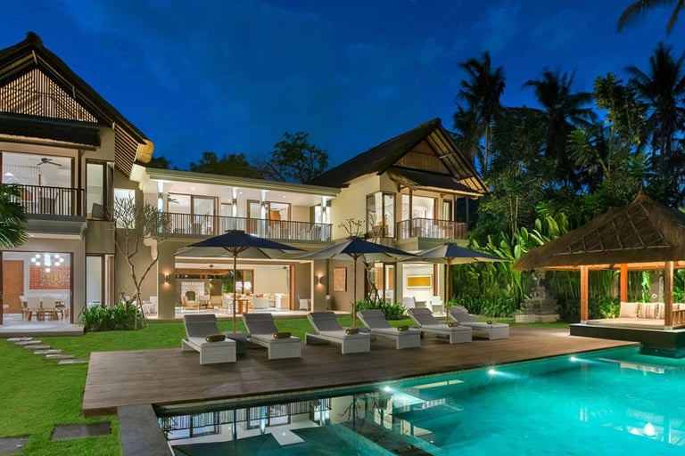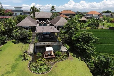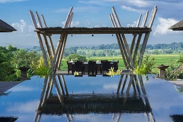 Three contemporary Balinese-style pavilions are arranged around a 25-metre swimming pool, which forms a magnificent focal point to the villa. A rustic bamboo pavilion surrounded by water gardens at the end of the pool offers unobstructed views and makes a lovely setting for sunny breakfasts and candle-lit dinners. Living areas and bedrooms are adorned with an eclectic collection of Indonesian artwork including avian-themed paintings, carved wooden statues from Kalimantan, and ethnic artefacts.