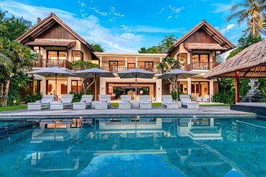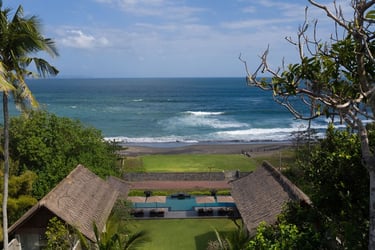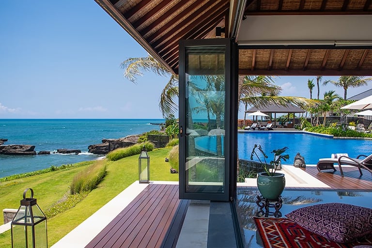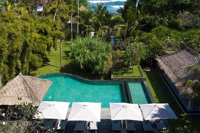 Built for large family vacations, the living pavilion at the south end of the pool has glass doors that fold back to create a seamless indoor-outdoor experience. Meanwhile, a pool balé at the northern end is yet another perfect spot for you to relax and soak up the views. Should you manage to tear yourself away from the villa, just go wandering about and discover rice fields, coconut groves and shaded lanes lined with banana groves and mango trees, as well as ornate sea temples that can be reached by a clifftop path.